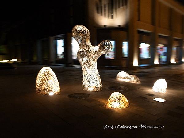 背起我的流浪背包,走路去中華藝校旁的公共腳踏車站,租借了台腳踏車,開始沿著愛河一路騎到鹽埕區,先去Booking還書。然後騎去新樂街南哥燒烤店旁買杯冬瓜烏龍茶,再騎往駁二方向。這次與我有緣的腳踏車編號是1156,好騎啊! 讓我們想到我們家那台30幾年的捷安特淑女車。路途中發現鹽埕教會美麗的教堂,還有鹽埕國小圍牆上可愛的馬賽克拼貼磁磚。想到去看看駁二的大黃蜂還在不在,卻先發現新的發光體,很像那個白色的胡椒罐?我繞來繞去,希望腳踏車速度跟相機快門速度趕快取得共識,不知這樣的追焦有沒有算成功,還是再接再厲好了?
