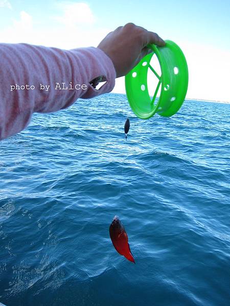 船公司給我們的釣魚器具是一個綠色塑膠圓環,魚鉤鉤上小章魚(透抽?)當餌就放線丟下海去。基本上線放到底再回收後魚就會上鉤了,遺憾的是,上鉤了但是釣不上來。><。我好幾次跟小魚拔河奮戰,但.....都輸了。魚鉤被扯斷,魚兒逃之夭夭。如果魚鉤器材牢固點應該是可以把魚釣上來的。或許我跟魚兒小管這些海中朋友真的是沒緣分啊~算了吧,還好Alice跟Alice's brother都有釣到,反正圖的也是一番新鮮啦。(圖片的魚叫做〝紅新娘〞,身體是很鮮豔的紅色,很漂亮。)